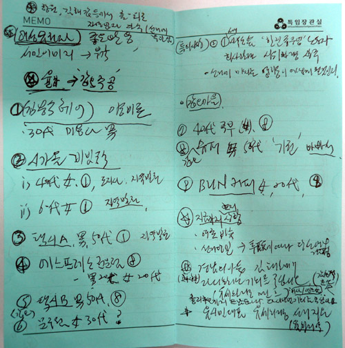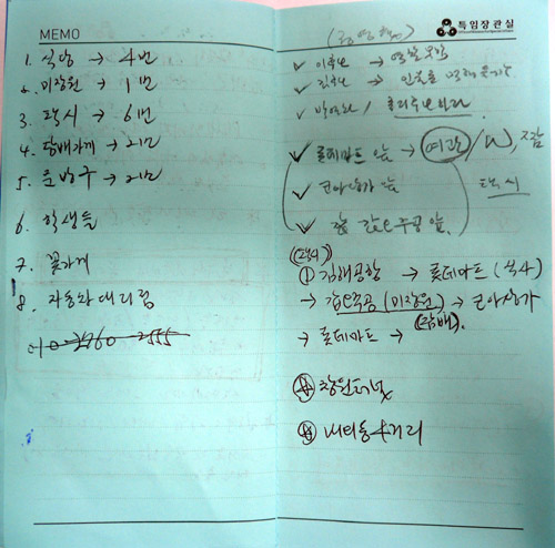 선거 정보 수집 및 민심 파악 관련 특임장관실 직원의 동선으로 추정되는 문구들도 있다. 수첩에는 "롯데마트 앞, 코아상가 앞, 갑오주공(미장원)"이라고 돼 있다.