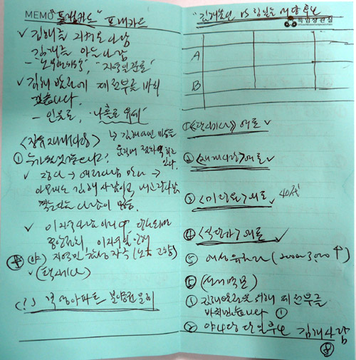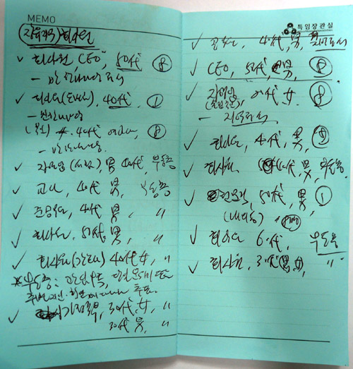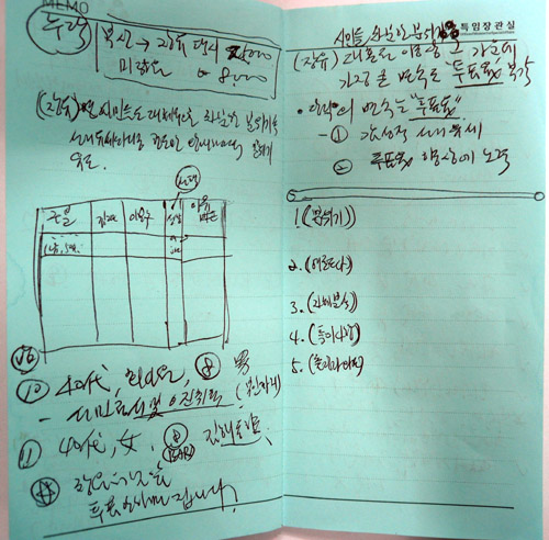 수첩 내용을 보면 "여론(후보 평가를 듣는다) 장단점", "택시를 여러대 탄다", "자동차 대리점/꽃가게/문방구/학생들", "특이한 소문", "아줌마 스킨십" 등 선거 정보 수집에 관한 방법 등이 적혀 있다.