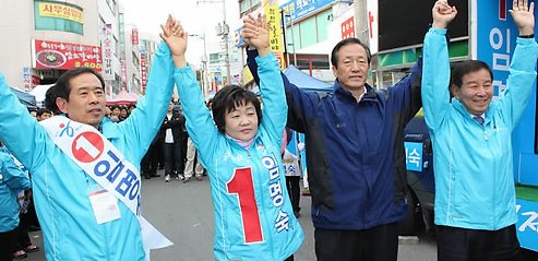 | ▲ 23일 울산 동구청장 재보선 지원유세에 나선 정몽준 전 대표(오른쪽 두번째). ⓒ연합 |