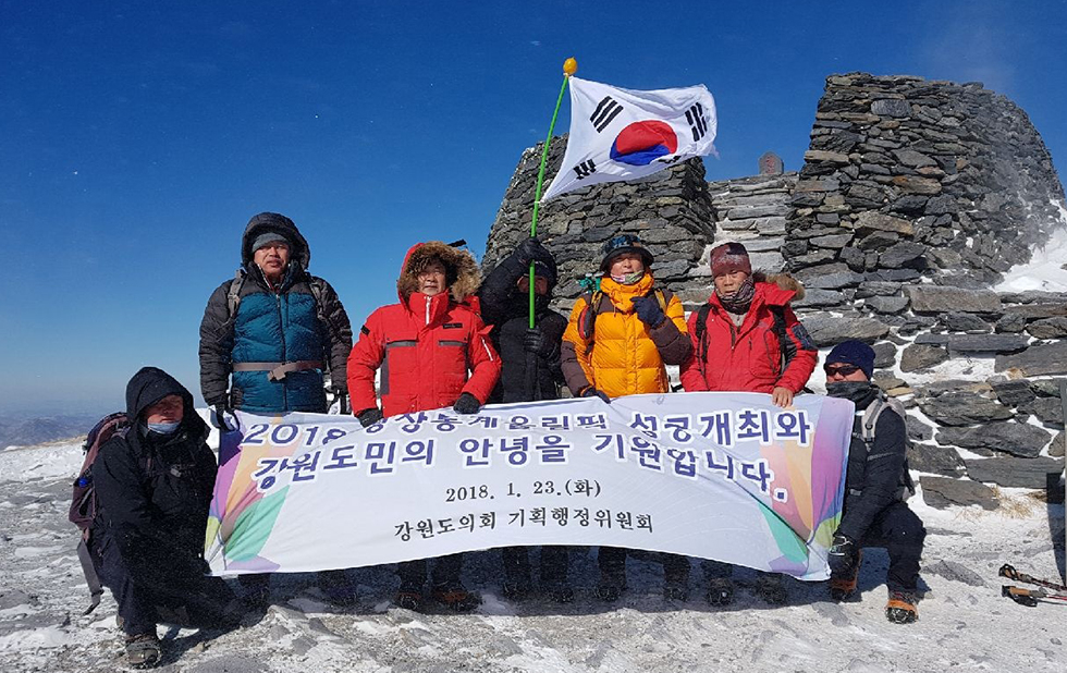 ▲강원도의회 기획행정위원회 도의원 6명과 전문위원실 직원 4명이 지난 22일 ‘제25회 태백산 눈축제’ 현장을 방문한데 이어 해발 1567미터 태백산 천제단에 올라 2018 평창동계올림픽과 제25회 태백산 눈축제 성공개최 의지를 다지고 있다. ⓒ태백시