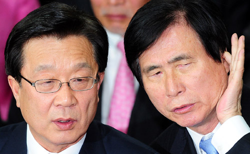 | ▲ 한나라당 강재섭 후보가 분당갑이 지역구인 고흥길 의원과 함께 심각한 표정을 짓고 있다. ⓒ뉴시스 |