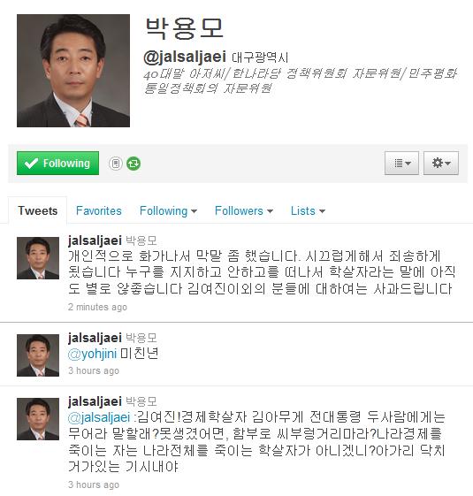 박용모 씨는 19일 본인의 트위터에 김여진 씨의 이런 주장에 대한 불쾌감을 노골적으로 토로했다. 문제는 그 과정에서 김여진 씨의 실명을 거론하며 욕설과 비속어를 여러 차례 사용한 것. 김대중 전 대통령을 지칭해 "경제 학살자"라고 주장하기도 했다.