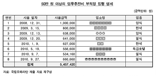 이 단장이 쓴 신용카드 비용이 정해진 판공비 예산을 넘을 때 그 금액을 공연사업비에서 지출한 것을 감사원이 적발한 것이다. 당연히 그렇게 쓴 돈은 구체적인 지출목적과 사용 용도를 기재하지도 않았다.