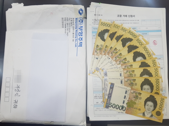 이에 현금을 받은 B 조합원은 이사장의 불법 기부행위 등 사전 불법선거운동을 고발하는 차원에서 현금과 조합원가입신청서를 (주)부영주택 봉투에 밀봉해 2017년 9월 28일경 김 이사장에게 받았던 것을 감사실장에게 밝히고 전달했다. 이 자리에서 감사실장은 “김 이사장과 협의 하겠다”며 봉투를 수령했다.