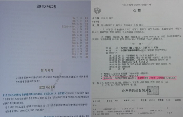 특히 그동안 임원선거가 있는 총회일에 조합원들에게 기념품 및 선물 증정을 단 한 차례도 하지 않았는데, 오는 24일 임원선거 당일 오전 10시 30분까지 투표장에 입장하는 조합원들에 한해 기념품 교환권을 준다는 내용을 담아 각 조합원들에게 공문을 발송해 임원선거에 영향을 줄려는 의도가 비쳐져 한층 더 의혹을 증폭시키고 있다.