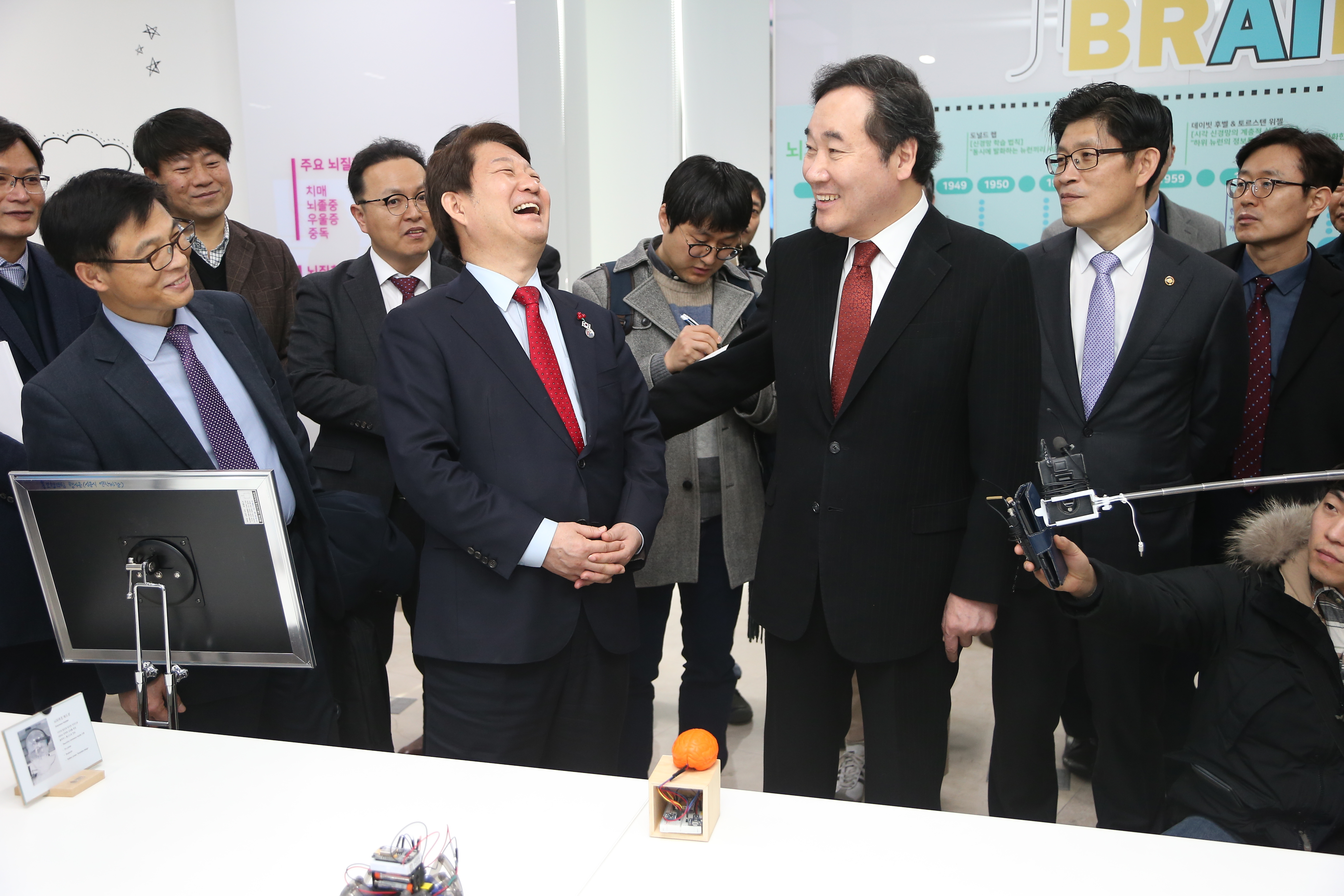 한국뇌연구원을 방문한 이 총리는 "뇌신경회로망 연구를 통해 4차 산업혁명 시대를 선도할 수 있는 차세대 인공지능 개발의 초석을 놓아달라"고 주문하고 "치매 등 난치성 뇌질환 극복을 통한 국민건강 향상 및 삶의 질 개선에 노력해 달라"고 당부했다.