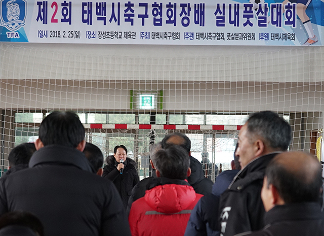 ▲25일 태백 장성초교 체육관에서 열린 실내 풋살대회에서 김연식 태백시장이 인사말을 하고 있다. ⓒ태백시......