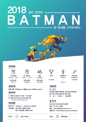 브리티쉬 아메리칸 토바코의 한국법인인 BAT 코리아(대표 매튜 쥬에리, 이하 BAT 코리아)는 오늘 미래 세대의 꿈을 지원하는 제 2회 ‘BAT MAN’ 공모전의 막을 올린다.