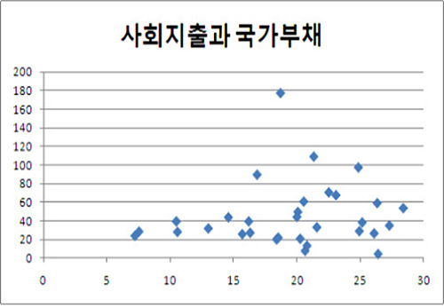 "사회지출이 그렇게 좋다고 치자, 그렇지만 함부로 복지 재정을 늘리면 나라가 거덜난다는 사람들도 있다. '그리스 봐라, 남미 봐라'라고 한다. 정말 그럴까? OECD 국가의 사회지출과 국가부채의 상관관계를 들여다 봤다. 압도적으로 부채가 많은 국가는 일본이고 그 외에 다른 나라들을 보면 둘 사이에 아무 관계가 없음을 알 수 있다. 사회지출과 국가부채는 아무런 관련이 없다."