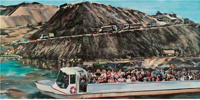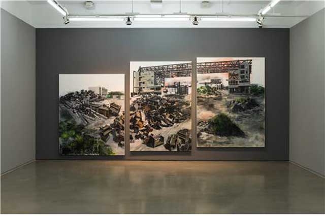 정면으로 만날 수 없는 인간 군상들. 사람들이 내몰리고 있는 도시의 한복판, 작품은 그 무리수를 고발하는 장면의 연속이다. 현장에서 만난 밀리고 밀린 사람들. 외곽으로 가야 하는 사람들에게서 도시가 만들려는 풍경들의 패턴은 같다. 자본과 결탁한 신자유주의 행복의 질서, 그 동질성의 맥락을 들추어낸다. 작품에서 화면은 사각으로 도려내 지거나 뭉개져 있다. 높은, 혹은 무너진 담벼락에는 여지없이 허물어져 가는 기둥이 있고 문지방이 있다. 자본주의의 구축이 의미하듯, 작품은 여러 도시를 무너뜨리고 다시 새로운 일의 반복이 일어남을 여실히 묻는다. 낙동강 주변, 베를린 크루즈 관광의 모습, 정부의 도시개발 청사진들에서 사람은 보이지 않고 자본만 보이는 현상을 고발한다. 이러한 동질성의 패턴은 작가의 상상이 아니라는 점이 더 놀랍다. 작가는 연구했고 현장을 탐색했다. 어떤 가난한 사람들은 파푸아뉴기니아에 갇히기도 했다는 걸 보면, 신자유주의는 또 다른 은폐와 권력이 작동되는 토대를 만드는 것일지도 모른다.