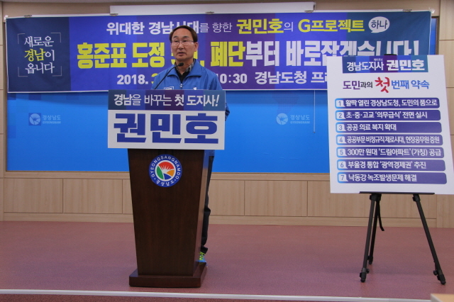 권민호 더불어민주당 경남도지사 예비후보가 홍준표 자유한국당 대표의 경남도정에 대해 폐단부터 바로잡겠다며 홍 전 지사의 채무제로는 대권도전을 위한 생색내기용이었고, 자신의 정치기반 구축만을 위한 허구였다고 정면으로 비판하고 나섰다.
