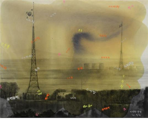 전시 작품은 남한 사람, 일본 사람, 네덜란드 사람, 북한 사람, 탈북했다는 사람들의 소리로 가득했다. 각자의 시각에서 전시 작품은 남북한의 분단 현실을 이야기했다. <이상한 풍경>(김정헌 작)은 1946년생 원로의 작품답게 남북한의 국가상징 태극기와 인공기를 하늘에 높이 세운다. 그 곁에 사람들의 목소리를 담아냈다. 그 의성어들은 마치 태극기와 인공기를 조롱하는 듯했다.