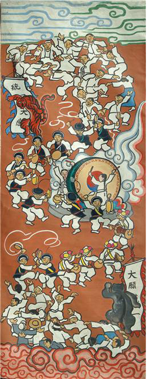 오윤의 그림은 곰과 호랑이도 덩실덩실 춤추는 통일이다. 함께 기뻐하고 춤추는 것이 우리의 소원이라는 작품이다. 어깨가 들썩이는 춤사위가 꽹과리 소리와 함께 떠들썩하다.