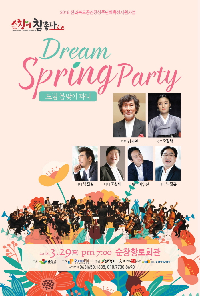 군에 따르면 3월 '문화가 있는 날'을 맞아 순창 향토회관에서 ‘2018 드림 봄맞이 파티’라는 테마로 오케스트라 공연을 오는 29일 오후 7시에 개최한다고 밝혔다.