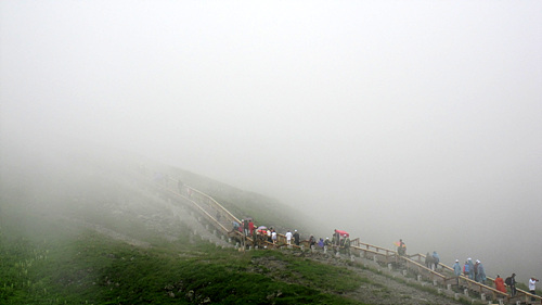 주차장에 도착하면 그때부터는 1264개의 계단길이 시작된다. 2006년 처음으로 돌로 계단을 쌓았고 지난해에는 나무 계단이 완성됐단다. 안개 때문에 끝이 보이지 않는 것이 오히려 다행이었을까. 한 걸음 한 걸음 내딛을수록 숨소리는 거칠어졌고 함께 출발했던 일행들은 계단 위와 아래에 고루 흩어져 찾기가 어려웠다.