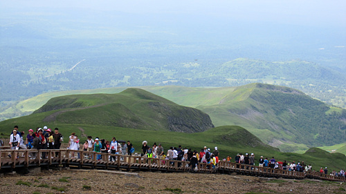초록의 풀들과 맞닿아 있고, 구비구비 솟아 있는 여러 봉우리들이 안에 파묻혀 있는 천지를 마주하기 위한 길은 셔틀 버스로 시작된다. 백두산의 서쪽 고개인 서파(西坡) 산문(山門)에서 탄 셔틀 버스는 해발 2400m까지 등산객들을 실어나른다. 셔틀 버스가 운행되는 백두산 도로는 지난해 완전히 개발됐다. 서파쪽은 북파에 비해 산세가 더 험준한 탓인지 도로 등의 정비가 늦어졌다. 산문이 세워진 것도 북파는 1980년대였지만 서파는 10여 년 뒤인 1998년이었다.