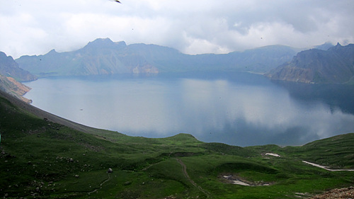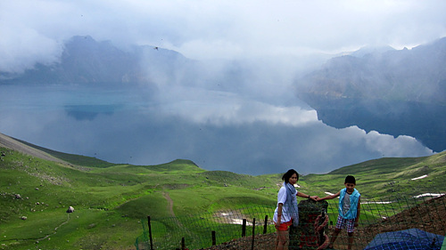 그리고 마지막 계단을 오름과 동시에 내내 내리던 보슬비는 사라지고 없었다. 천지에 눈과 마음을 빼앗겨 하염없이 바라본지 얼마나 지났을까. 가이드는 북한과 중국의 국경선이 바로 옆에 있음을 알려준다. 그러고 보니 관광객들은 한 곳에 몰려 그 넓은 천지를 몸싸움하며 바라보고 있었다.