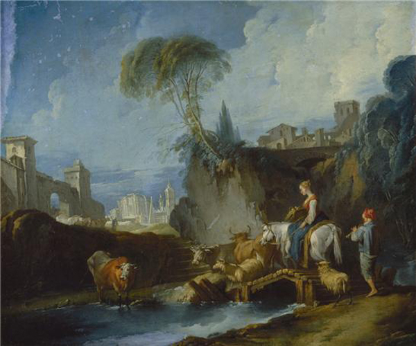 18세기 로코코 시대 미술은 루소의 자연주의 사상과 그 결을 같이한다. 프랑수아 부세의 <다리 건너기>는 자연을 새로운 시선으로 해석한 작품이다. 그는 현실을 그린 것이 아니라, 장식적인 로코코 시대의 빛깔을 실험했다. 청록색 톤의 색조는 빛바랜 레몬과 만나 붉은 산호와 겨룬다. 이탈리아의 풍경이 멀리 얼핏 보인다. 잔잔한 기운이 감도는 길목에 서서 개울에 흐르는 물소리를 듣게끔 한다.
