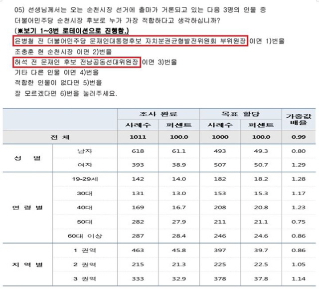 이번 여론조사는 순천지역 선거구에 성별과 연령·인구 비례에 의해 정해졌으며, 응답자 특성중 남성보다는 여성의 응답비율이 낮고 50대 보다는 20대의 응답자 비율이 낮은 것으로 나타났다.