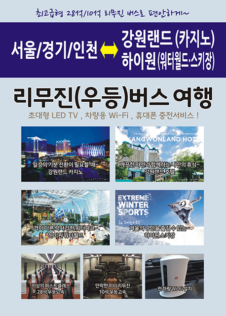 이에 따라 동부하나리무진은 ▲당일 워터파크 패키지 ▲강원랜드 연계 추추파크 숙박패키지 ▲강원랜드 연계 해양레일바이크 ▲강원랜드 당일 패키지 등의 관광상품을 개발해 이달 말부터 출시를 예고하고 있다.