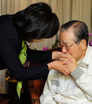| ▲ 나 후보 손등에 입맞추고 있는 김종필 전 총리. ⓒ뉴시스 |