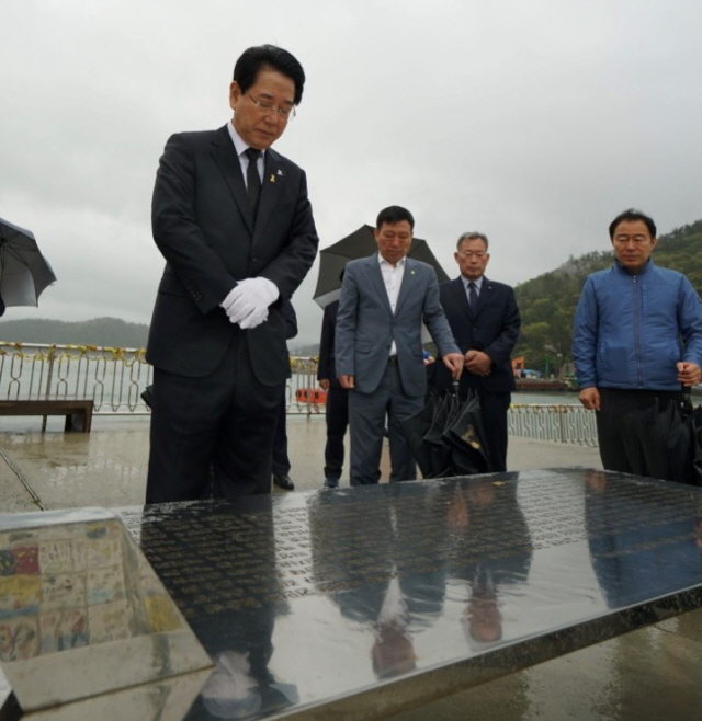 그는 또 방파제 인근 세월호 희생자의 이름이 적힌 은빛 추모판 앞에서 묵념하고, 돌아오지 못한 실종자 5명의 이름을 일일이 부르며 생환을 기원했다.