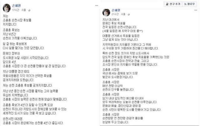 손혜원 의원은 지난 14일 자신의 페이스북에 “지난 대선에서 문재인 후보 득표율 전국 일등은 순천시였다면 대통령 선거에서 득표율 일등은 그냥 쉽게 되는 것이 아니다”며 “지방 소도시에서 압도적 전국 일등 문재인 후보 득표율을 기록했다는 것은 조충훈 시장의 전략과 전술, 그리고 조시장 본인의 지지율이 역할을 했을 것이다”고 홍보했다.