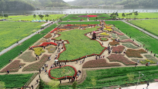 유채꽃과 형행색색의 튤립으로 그려진 한반도와 튤립과 청보리로 만들어진 태극기 공원이 낙동강유채축제장을 찾은 많은 상춘객들에게 큰 인기를 끌고 있다.