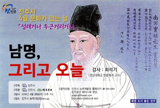첫 번째 4월 행사는 26일 저녁 7시 능력개발원 세미나실에서 최석기 경상대 한문학과 교수의 ‘남명 그리고 오늘’이란 주제의 강연과 함께 이해를 돕기 위한 청중과의 대화의 시간도 마련된다.