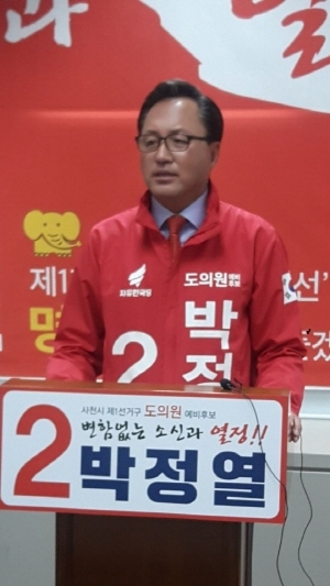 자유한국당 박정열 도의원은 19일 사천시청 2층 브리핑룸에서 기자회견을 열고 “변함없는 소신과 열정으로 사천시민의 수족으로 활동하기 위해 사천시 제1선거구 최초의 재선 도의원에 도전한다”고 밝혔다.