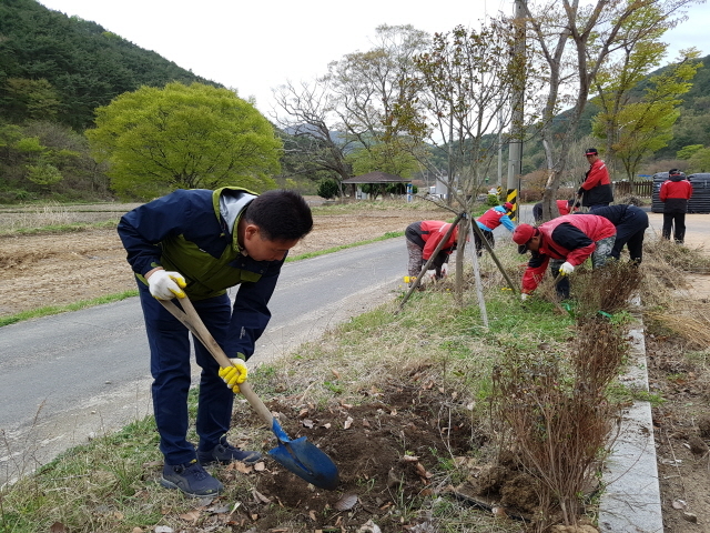 이날 마을입구 잡풀을 제거하고 주차장 주변에 영산홍 100여주를 식재했다.