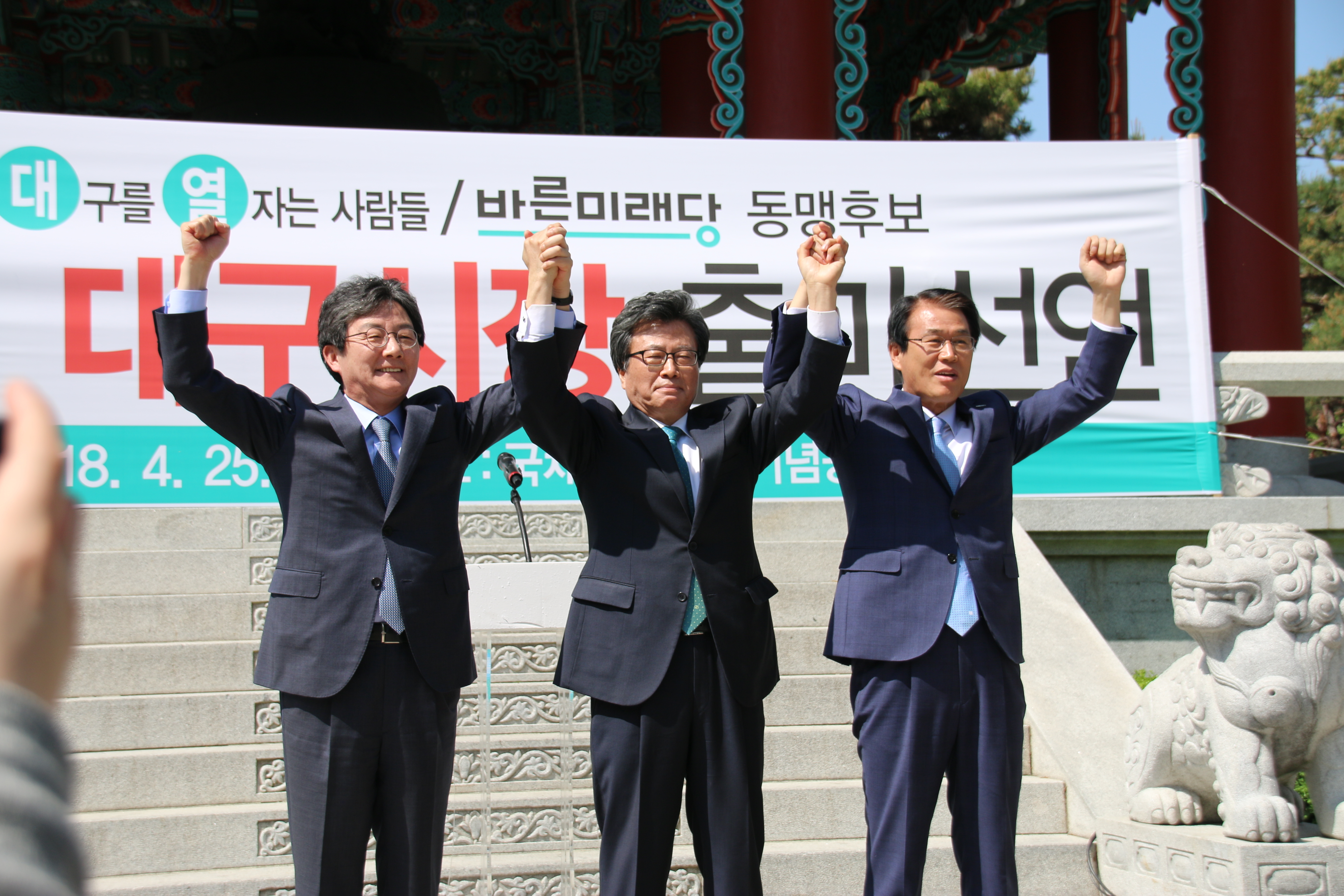 유 대표는 "김 교수는 지방분권과 지역발전, 대구의 정치에 대해 깊이 생각해 오셨던 분이고 경제전문가"라고 추켜 세운 뒤 "제가 걷고자 했던 개혁보수의 길과, 김 교수가 대표해 왔던 합리적 중도개혁의 길을 합쳐야 자유한국당과 민주당이 바뀔 수 있다고 주장해 오던 분"이라며 바른미래당과 새대열의 대구시장 선거 동맹의 의의를 강조했다.