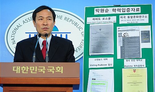앞서 나경원 한나라당 서울시장 후보를 지원하고 있는 무소속 강용석 의원은 하버드대 로스쿨에 메일로 문의한 결과 '원순 박'이라는 연구원은 없었다면서 박 후보의 하버드 로스쿨 경력이 '허위'라고 주장했다. 강 의원은 하버드대에 박 후보가 1991∼1994년 '로스쿨 객원연구원'으로서 '학위(degree)'를 받았는지를 문의한 결과, 하버드대는 "박 씨가 학위를 받지 않았다는 것은 확실히 말할 수 있다. 그러나 해당 기간 객원연구원에 대한 우리의 자료가 확실하지 않기 때문에 그가 객원연구원이었는지 아닌지를 확실히 말씀드릴 수 없다"는 e메일 답신을 강 의원 측에 보냈다(객원연구원은 원래 학위를 받을 수 없다)고 강 의원이 밝혔다.
