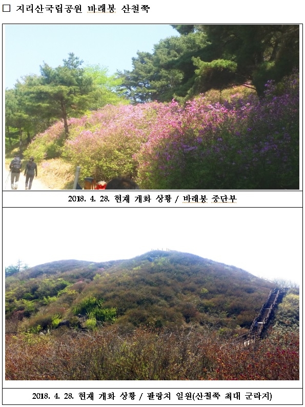 30일 공단은 "28일 현재 바래봉 중단부(5부 능선)에서 꽃망울을 터트리고 있으며, 정상부(바래봉~팔랑치~부운치 능선)는 5월 첫째 주말께부터 개화를 시작해 10일 전후로 만개할 것으로 보인다"고 설명했다.