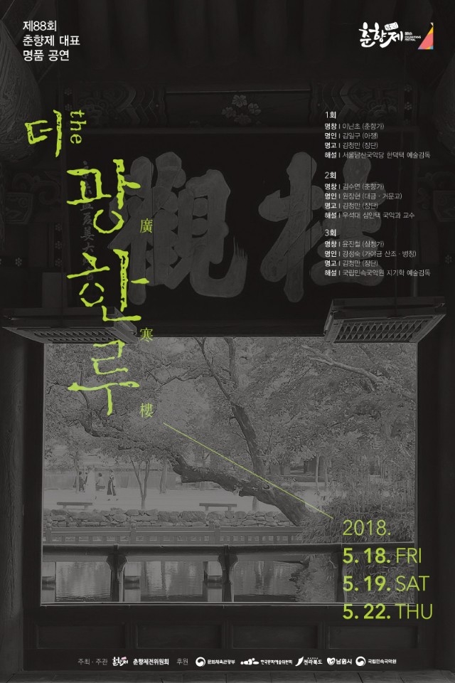 명품 공연을 선사할 18일 1회차 공연에는 서울남산국악당 한덕택 예술감독의 해설로 이난초 명창(중요무형문화재 제5호 판소리 홍보가 이수자)의 춘향가, 김일구 명인(중요무형문화재 제5호 판소리 적벽가 준보유자)의 아쟁 연주가 꾸며진다.