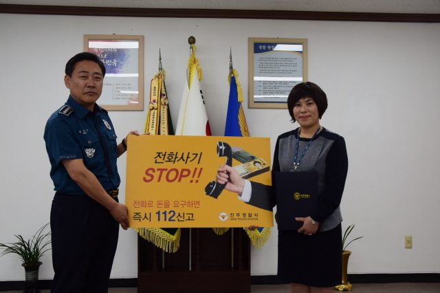 경남 진주경찰서는 11일 서장실에서 신속한 대처와 적극적인 신고로 두 차례 보이스피싱 범죄를 예방한 진주축협 강남지점 이은숙(45‧여) 과장대리에게 경찰서장 감사장을 전달했다.