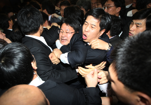 | ▲지난해 12월 18일 국회 외교통상통일위원회 위원장실 앞에서 한미 FTA 비준안 상정에 반대하는 강기정.백원우 의원 등 민주당 소속 의원들이 출입을 저지당하자 몸싸움을 하고 있다. ⓒ연합뉴스 |