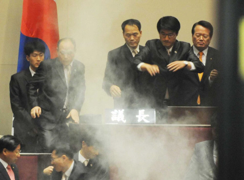 | ▲ 한나라당이 국회 본회의장을 기습 점거한 22일 오후 서울 여의도 국회 본회의장에서 민노당 김선동 의원이 정의화 국회부의장응 향해 최루가루를 뿌리고 있다. ⓒ뉴시스 |