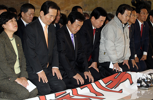 | ▲민주당은 연석회의에 앞서 열린 규탄대회에서 40여 명의 의원들이 국회 본청 로텐더홀 앞에 무릎을 꿇어 사죄의 마음을 표현했다. ⓒ연합뉴스 |