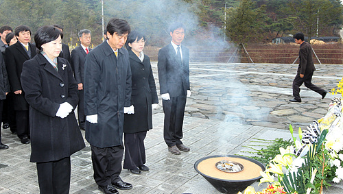 앞서 노 전 대통령의 묘소에서 이정희 공동대표는 "누구도 차별받지 않고 또 죽음을 생각하지 않아도 되는, 사람이 사람답게 존중받는 세상을 통합진보당이 반드시 만들겠다"고 다짐했다.