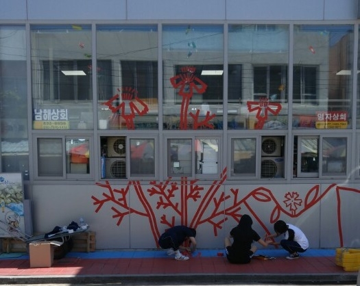 지난 23일 5월 행사에 앞서 시작을 알리는 특별프로그램으로 사천여고 20여명의 학생들과 함께 용궁수산시장 내외 벽면 및 바닥에 ‘바다에서 피는 꽃’이라는 주제로 붉은 테이프로 예술 작업을 펼쳤다.