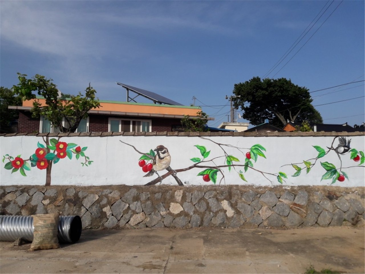 마을 광장 담벼락에 까치, 동백 등 그려 아름다운 마을로 탈바꿈