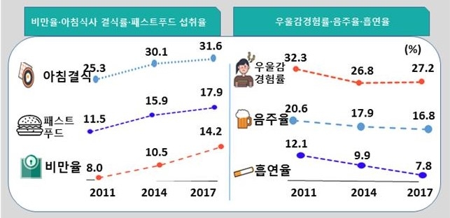 2017년 중·고등학생의 주3회 이상 패스트푸드 섭취율은 17.9%로 전국 20.5%보다 2.6%p 낮지만 지난해보다는 0.3%p 증가했다.