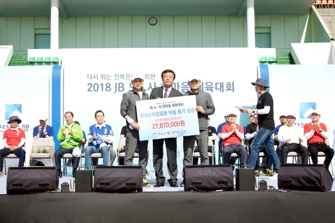 이번 성금 전달은 지난 26일 전주 종합경기장에서 개최된 '전북은행 2018년 JB 노·사 한마음 체육대회'를 기념하며 직원들이 십시일반 정성껏 모금한 성금을 전주시에 기탁한 것.