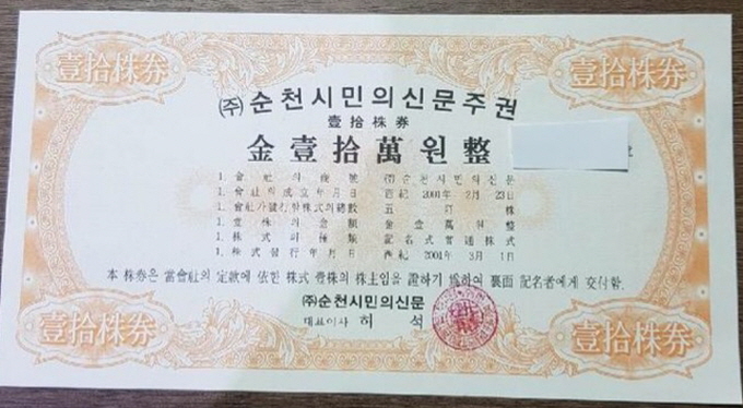 허석 후보가 ‘순천시민의 신문’ 법인을 만들기 위해 시민들로부터 5000만 원의 시민주를 모집하면서 발급했던 주권이 휴지조각이 되어 일부 주주들이 지역 인터넷 매체 언론사에 제보해 지난달 31일 보도됐다.