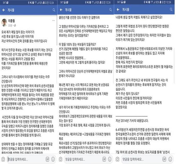 끝으로 그는 “저번 조충훈 시장의 범죄경력 또한 시민들에게 맡겼듯이, 이 또한 시민들의 판단에 맡겨야지요”라며 “내가 주인이고 내 부모와 친구들이 사는 이 순천시가 정의롭지 못하는 후보에게 맡겨지는 것이 싫다”고 전했다.
