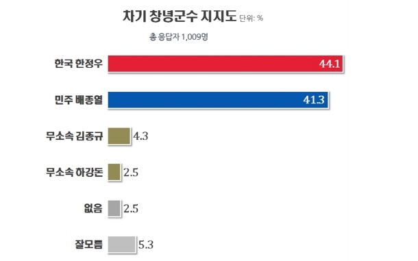 시사경남, 창원일보가 창녕군수 적합도 조사를 여론조사 전문기관 리얼미터에 의뢰한 결과 자유한국당 한정우가 44.0%로 가장 높게 나타났고, 다음으로 더불어민주당 배종열 후보가 41.3%로 나타났다.