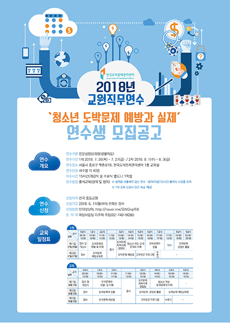한국도박문제관리센터(원장 황현탁)는 전국 중등교원을 대상으로 여름방학 기간 중 2회(7월 26~27일, 8월 1~3일)에 걸쳐 ‘청소년 도박문제 예방과 실제’를 주제로 교원직무연수를 진행키로 하고 오는 11일부터 지원자를 모집한다.