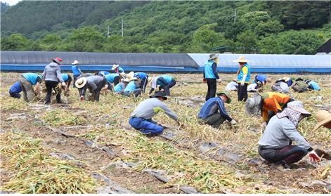본격적인 수확 철을 앞두고 일손이 부족해 적기에 양파 및 마늘을 수확하지 못하고 있다는 안타까운 소식을 접한 심덕섭 지사장을 비롯한 지사 직원 15여명이 자원해 무더운 날씨속에서 양파 및 마늘 수확과 운반을 도왔다.