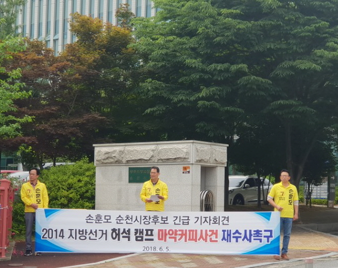 순훈모 순천시장 후보가 5일 광주지방검찰청 순천지청 정문 앞에서 2014 지방선거 허석 캠프 마약커피사건을 재수사 할 것을 촉구하는 기자회견을 갖고 허석 후보를 순천지청에 고발했다.